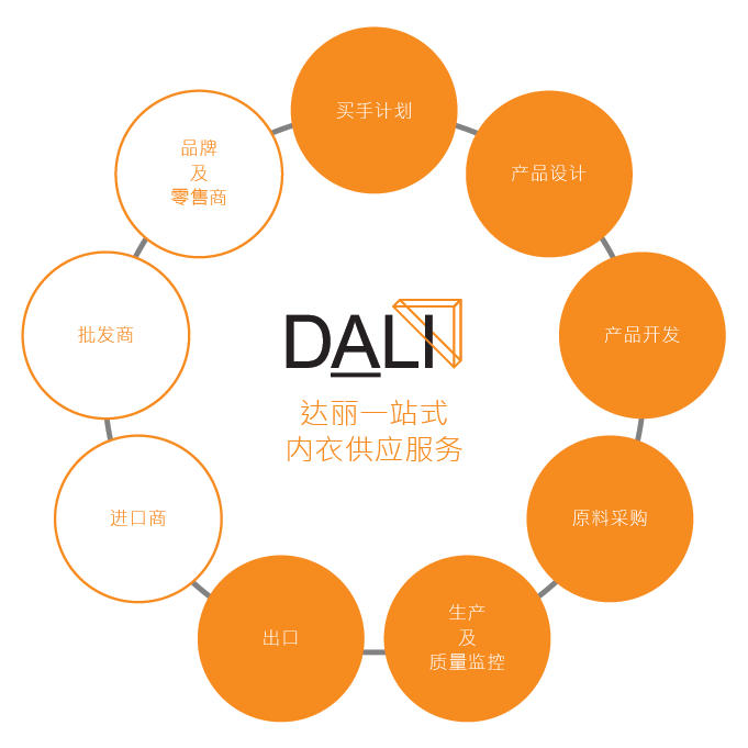 "达丽的资深专业团队,不但能够按客户的需要找出最佳的内衣产品匹配,而且还能提供完善的客户服务丶快速可靠的订单交期及具竞争力的采购价格。"