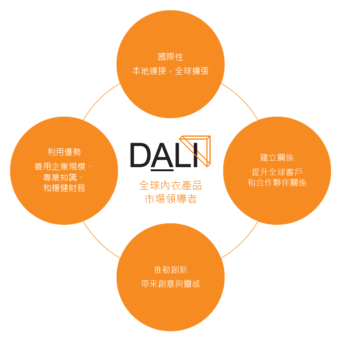 "達麗的資深專業團隊,不但能夠按客戶的需要找出最佳的內衣產品匹配,而且還能提供完善的客戶服務、快速可靠的訂單交期及具競爭力的採購價格。"