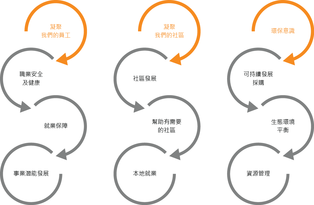 我們致力實踐多元化的工作環境、秉承我們的核心價值、關懷員工和提升員工的參與、培訓人才、著重事業潛能發展與及提供一個互相尊重、安全及健康的工作環境,並提供適當的就業保障,這都是我們可持續發展策略的至關重要元素。